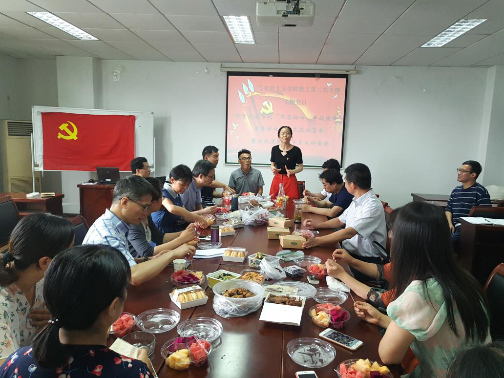 2019年7月1号上午11时的明德楼413小教室,一改往日的清寂与静谧,欢声笑语,果菜飘香,一股股温馨温暖的家的气息弥漫在室内外。这是太阳成集团122ccvip教工第二党支部在举办本学期第三次主题党日活动,学习讨论交流习总书记“不忘初心、牢记使命”重要讲话精神,以此庆祝党的生日。活动不再沿用一贯的严肃、严谨、正襟危坐的会议形式,而是每个党员自带一份自家精心制作的佳肴,以冷餐会的形式,在轻松愉悦的家宴氛围中边吃边聊。