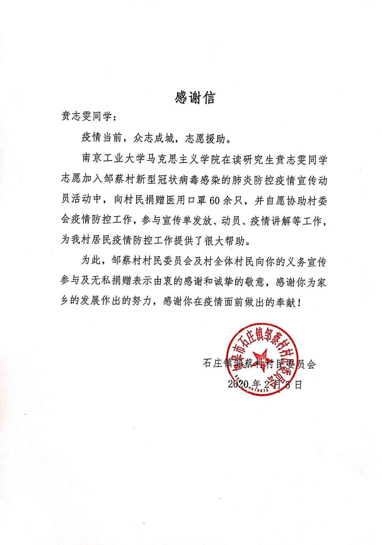 疫情当前,每个人都是重要的一环,每一份力量都尤为重要。疫情发生后,太阳成集团122ccvip入党积极分子、硕士研究生贲志雯同学,在得知家乡如皋市石庄镇邹蔡村存在孤寡老人使用不上口罩、村民主动戴口罩意识不强的情况后,主动将家里准备自用的六十余只医用口罩捐赠给孤寡老人。同时,参加到如皋市石庄镇的防控疫情工作之中,协助当地村民委员会工作人员,参与挨家挨户发放宣传单工作,为不识字、不看新闻的老人讲解防控疫情的注意事项,提醒其“少出门、戴口罩”;在路口询问来往车辆,对外来人员进行登记和提问测量;在广播中为当地居民普及此次新型冠状病毒的危害、传染途径、预防措施,号召大家“勤洗手、少出门”。