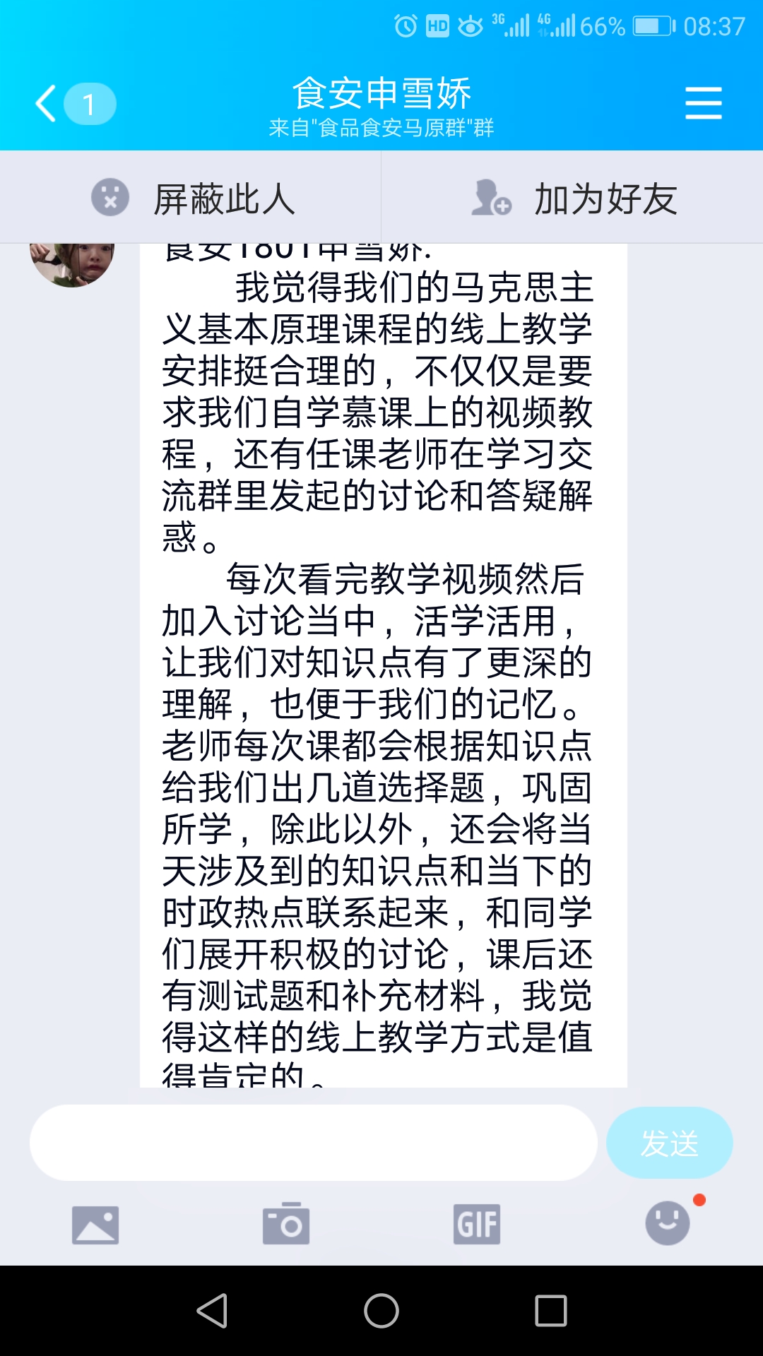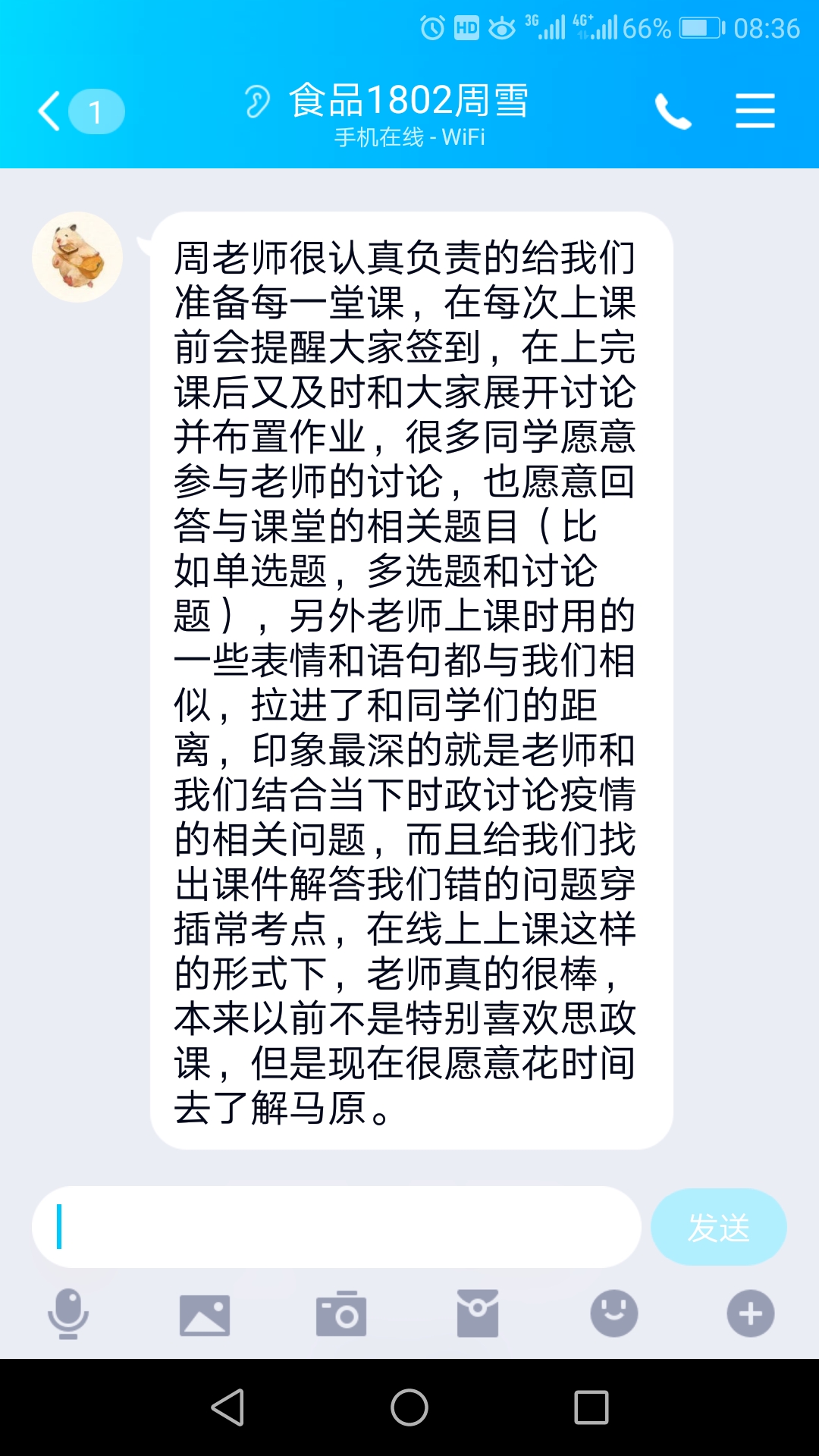 “讨论”是周老师线上教学的第二件“宝贝”,也受到同学们的热烈欢迎。王妍琳、周雪、刘雅知等同学纷纷表示,“在老师的鼓励下,也敢于在群里发言了”,“通过讨论,不仅get到了很多知识和不同的看法,更是掌握了一种学习方法”,“每次看完教学视频后加入讨论,活学活用,让我们对知识点加深了理解”。而且,周老师会结合时政热点发起线上讨论,比如疫情防控主题,引导同学们正确地看待和分析问题。