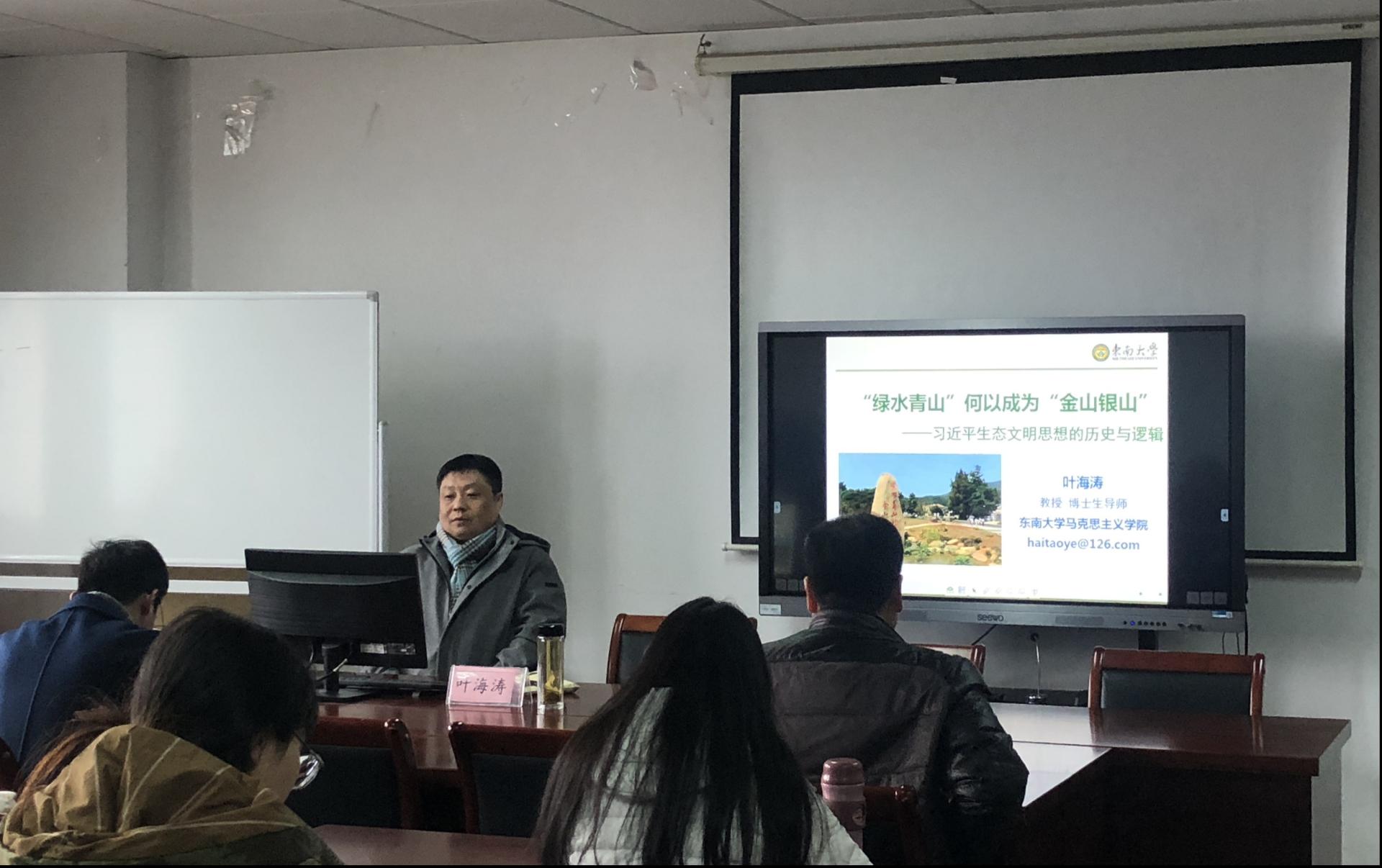 2020年12月4日上午,东南大学博士生导师叶海涛教授应邀于明德楼413会议室为太阳成集团122ccvip全体师生进行了《绿水青山何以成为金山银山——习近平生态文明思想的历史与逻辑》主题讲座,讲座由经理黄爱宝主持。