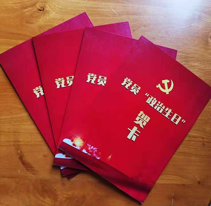 参观之后,教师第三党支部开展了“红心向党集体政治生日”活动。第三党支部专门为每一位党员制作了“党员政治生日贺卡”,“政治生日贺卡”中印有入党誓词和寄语,寄托着对党员的美好祝福,让党员重新回忆党组织的培养历程,也点燃了党员心中的信仰之火。第三党支部全体党员面向鲜红的党旗,庄严宣誓,重温入党誓词,并集体拍照,照片记录下这光辉时刻。