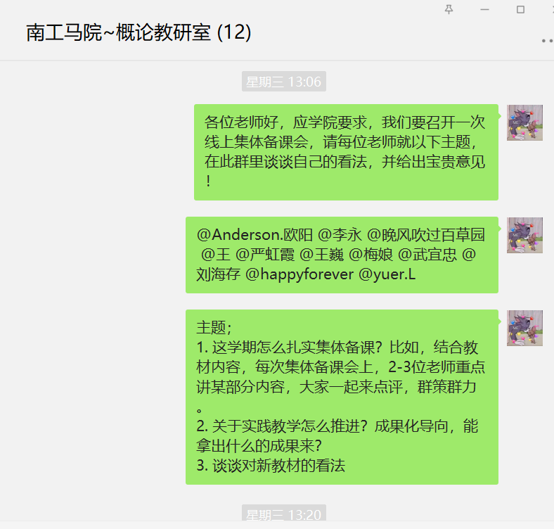 2021年9月8日,在公司统一工作部署下,《概论》教研室召开本学期第一次集体备会。由于疫情的影响,本次集体备课会以微信群里集体讨论形式进行。首先,教研室全体老师表达了对新教材的看法。大家普遍认为,新教材编写的很好,不再是报告文件式的表述,形式上更丰富,内容上加了不少参考材料,编排体系结构更加合理、逻辑性更强。既适合教学,也适合员工自学。其次,教研室全体老师对这学期怎么扎实集体备课进行讨论。大家一致赞同以后集体备课可以重点围绕新教材增加的新内容进行集体讨论备课,更新PPT,增加新的案例。第三,关于实践教学怎么推进。有老师建议,可以鼓励员工以团队形式做精品ppt,最好是做成微课视频,但是对员工的奖励需要各方面协调,光是成绩恐怕起不到激励作用。
