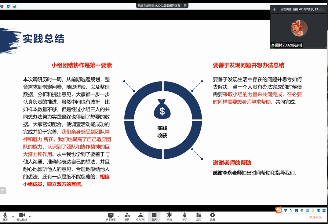 2022年6月26日下午,在公司统一工作的部署下,《概论》教研室举行了本学期实践教学成果展示。由于员工近期期末考试较多,部分班级正在进行实训或军训,很难找到适合的线下时间,所以本学期《概论》课实践教学展示活动采取腾讯会议形式。全体《概论》课任课教师及员工代表参加本次活动。