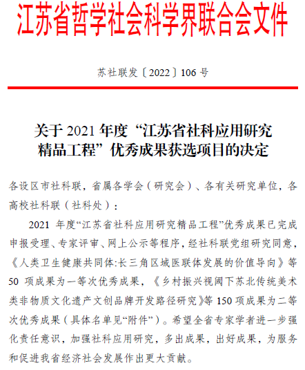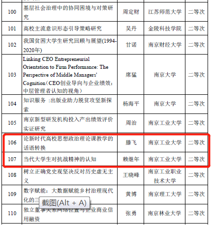 “江苏省社科应用研究精品工程优秀成果”评选,是省社科联推动全省社科界加强应用对策研究的一项重要举措。近日,江苏省哲学社会科学界联合会下发《关于 2021 年度“江苏省社科应用研究精品工程”优秀成果获选项目的决定》,公司赖继年老师的《当代老员工对抗战精神的认知》和滕飞老师的《论新时代高校思想政治理论课教学的话语转换》等2项成果荣获二等奖。