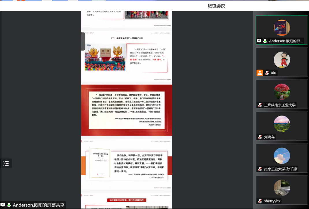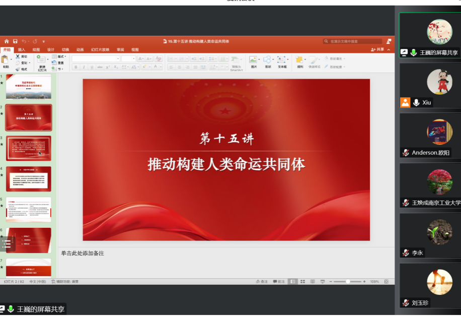 2022年11月16日,在公司统一工作部署下,《概论》课教研室召开本学期第四次集体备会。本次集体备课会重点学习习近平新时代中国特色社会主义思想和党的二十大报告。首先,王巍老师和张欧阳老师分别领学《习近平新时代中国特色社会主义思想概论》课的PPT课件的第十一、十五和第十三、四专题。其次,王焕成、李永和袁瑜老师做重点发言。最后,任课老师就如何把党的二十大报告的相关精神融入教学中做了研讨。