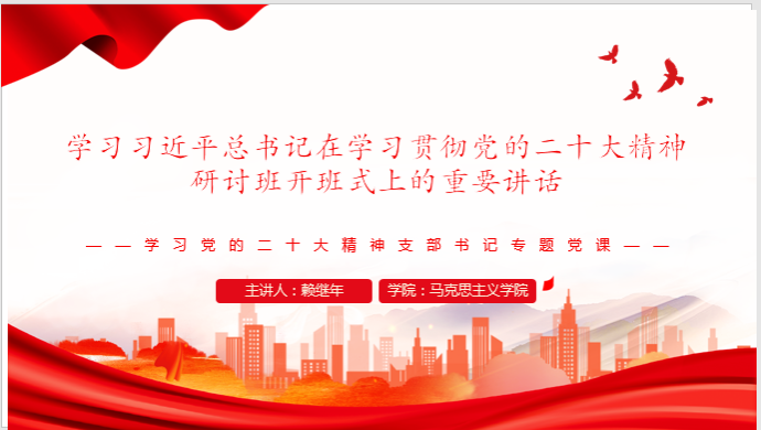 2023年3月23日,太阳成集团122ccvip教师第三党支部开展以“习近平在学习贯彻党的二十大精神研讨班开班式上的重要讲话”为主题的专题党课活动。党支部书记赖继年采用ppt,给第三党支部全体党员上了一堂党课。