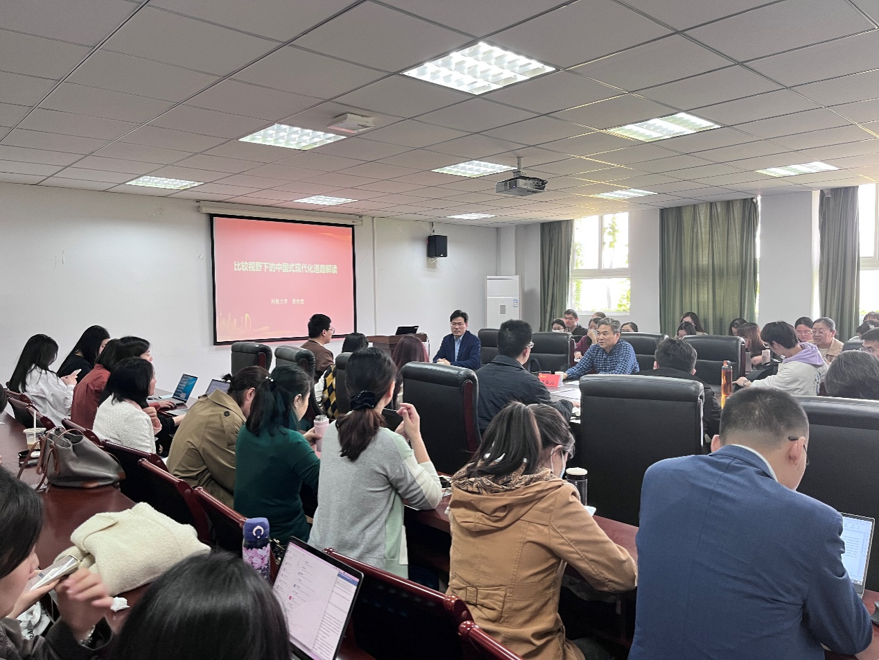 随后,黄教授给大家带来了《比较视野下的中国式现代化道路解读》专题学术讲座。黄教授从近代中国开启现代化进程、发展中国家探索现代化和中国式现代化超越西方现代化三部分展开:19世纪60年代中国内忧外患引发政权危机而被迫开启现代化,紧接着比较近代中国与拉美模式的现代化主要特征,指出其存在一定的局限性。中国共产党选择了马克思主义,在中国式现代化的实践中,实现了经济模式与政治模式的双重超越。中国式现代化是中国共产党领导的社会主义现代化,既有各国现代化的共同特征,更有基于自己国情的中国特色,中国式现代化道路的提出,不仅具有历史意义,而且具有世界意义,黄教授建议青年学者要从一般性中理解现代化的普遍本质,在特殊性中把握中国式现代化的本质属性。