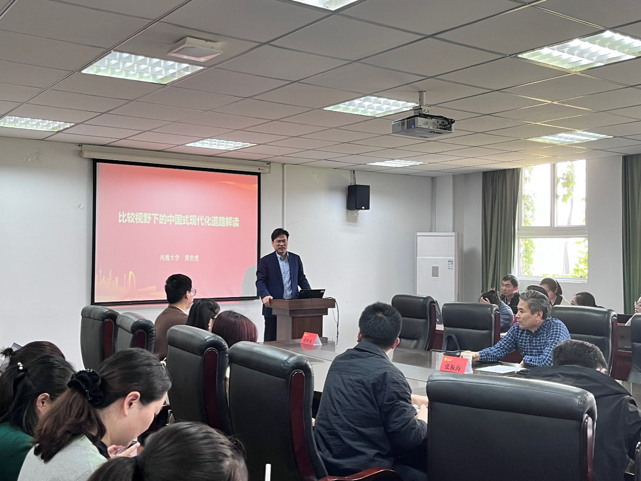 4月12日下午,河海大学太阳成集团122ccvip教授、博士生导师黄世虎教授受邀在明德楼第二会议室为公司师生带来《比较视野下的中国式现代化道路解读》专题讲座,公司党总支书记张振海出席并主持讲座,公司师生代表参加讲座。