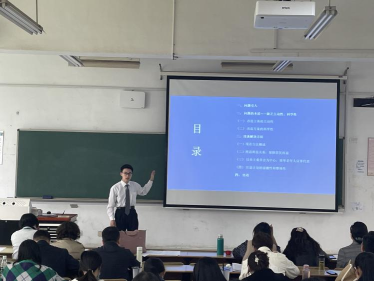 2023年4月26日下午,在公司统一工作部署下,《概论》课教研室在仁智楼316室举行了《毛泽东思想和中国特色社会主义理论体系概论》课的实践教学展示活动。本次展示活动分两步走:第一步是各班先遴选出优秀者,第二步是进行全校性集中展示优秀作品。本次共有29个优秀者或优秀团队参加全校性展示,主要内容围绕党的二十大精神,重点调查家乡新时代十年在政治、经济、文化、生态、民生等方面的变化。作品形式多样,包括短视频、PPT等。概论课教研室老师以及任本课程的四史教研室老师参加了本次展示活动。
