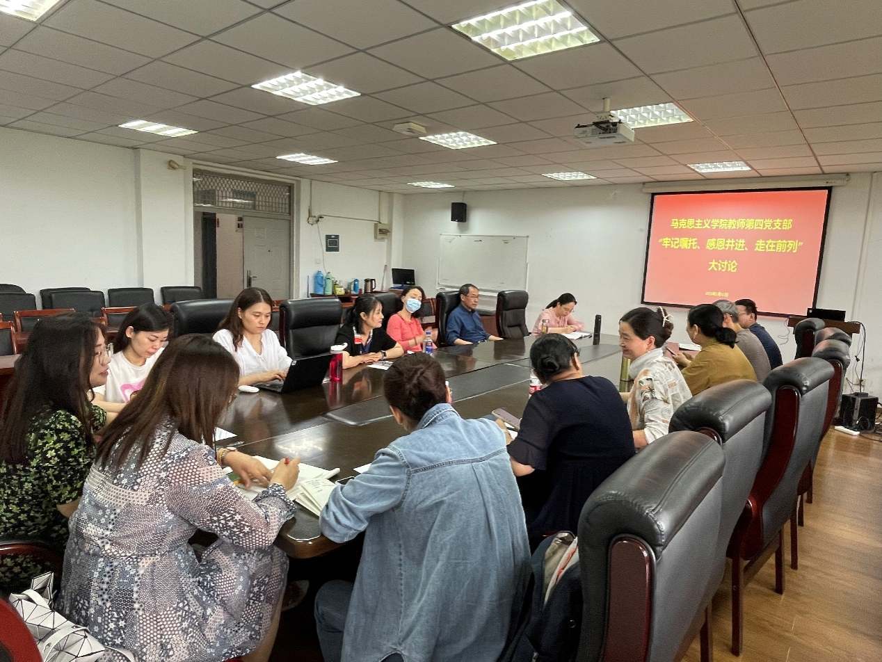 为深入推进学习贯彻习近平新时代中国特色社会主义思想主题教育,扎实开展集中学习研讨,5月31日,马院教师第四党支部全体党员开展主题教育第二次集中学习及 “牢记嘱托、感恩奋进、走在前列”大讨论。支部书记王芳主持会议,潘宏、朱书卉、张丽三位老师领学并作重点发言。