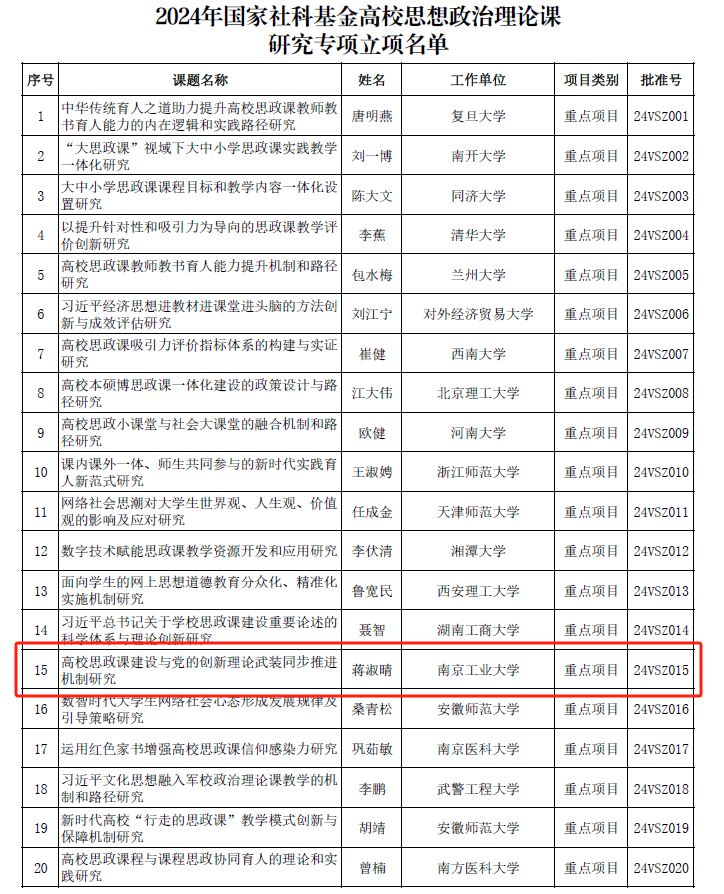 近日,全国哲学社会科学工作办公室公布了2024年国家社科基金高校思想政治理论课研究专项立项名单,公司蒋淑晴教授主持的“高校思政课建设与党的创新理论武装同步推进机制研究(批准号:24VSZ015)”获批重点项目立项,这也是公司继黄爱宝教授、贾可春教授之后再次获批国家社科基金重点项目。至此,公司近6年立项国家社科基金共9项(其中3项为重点项目)。