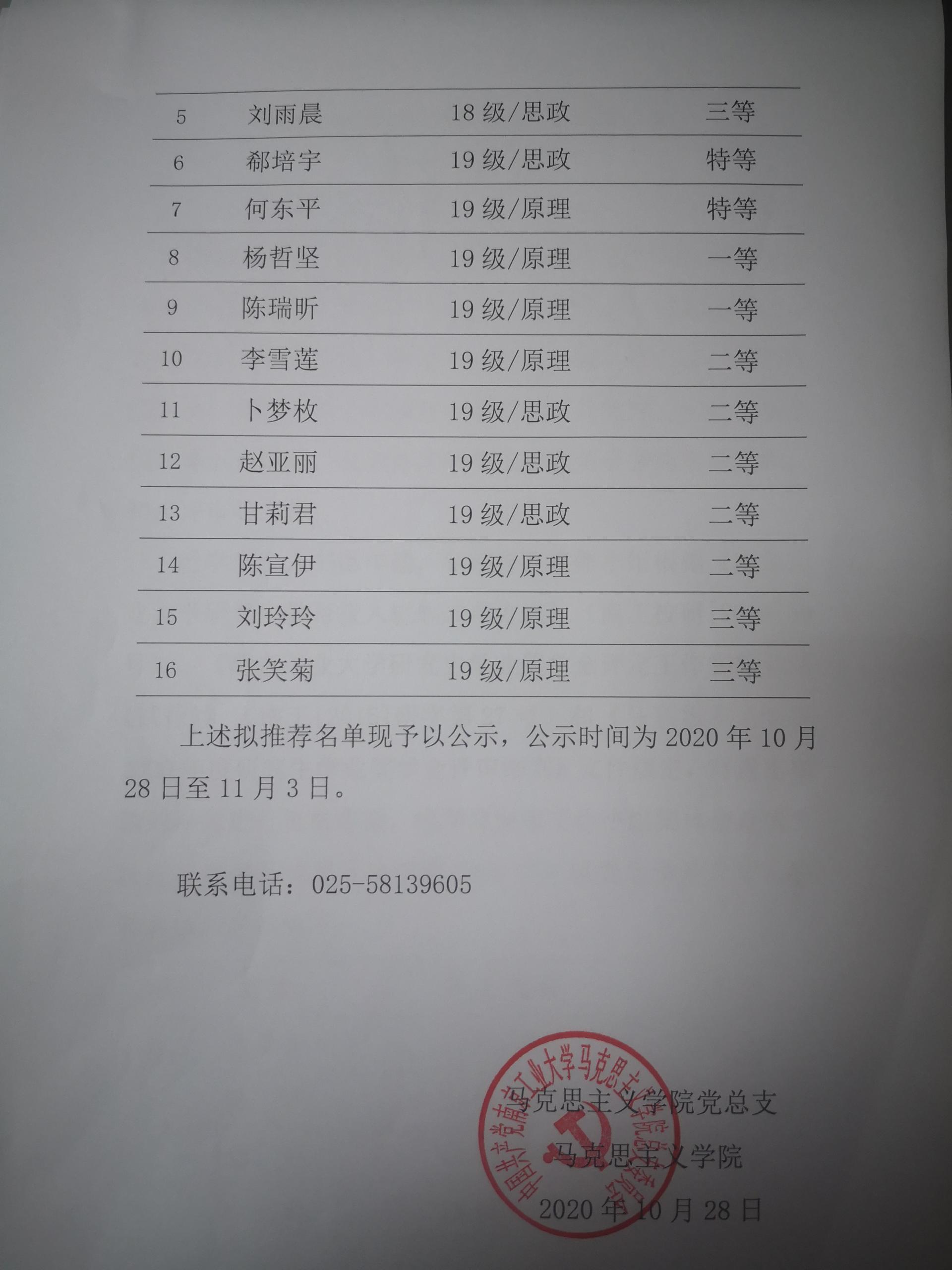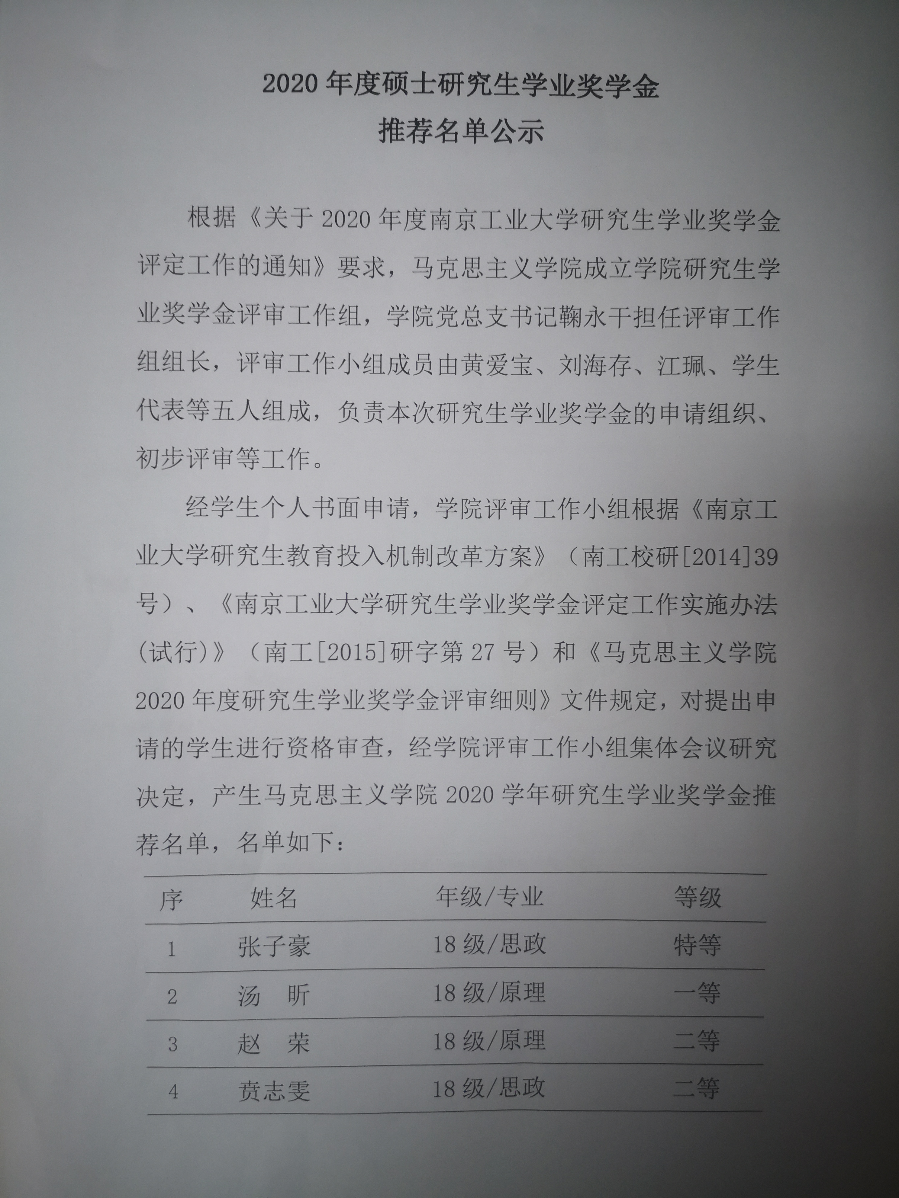 2020年度太阳成集团122ccvip硕士研究生学业奖学金推荐名单公示