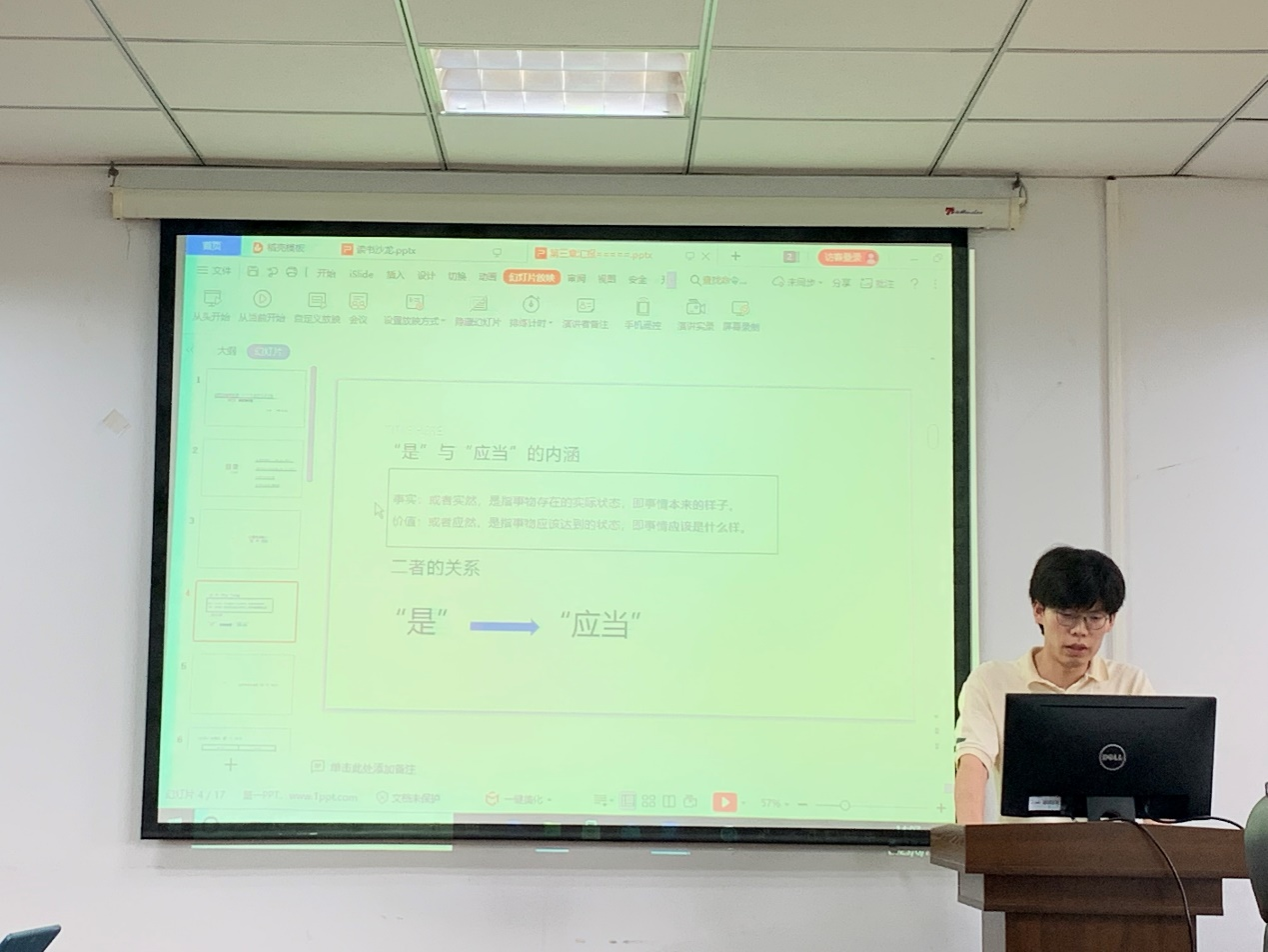 会上,十位研究生同学依次按书目章节顺序分享读书心得。王凯男同学围绕“应然”与“必然”的关系细致论述了自己的体会;卜宇同学分享了对目的与手段、德与才、内向效用等理论的见解;沈阳同学从知行合一、心理与心性、理论指导实践等角度分别阐述了知行关系。